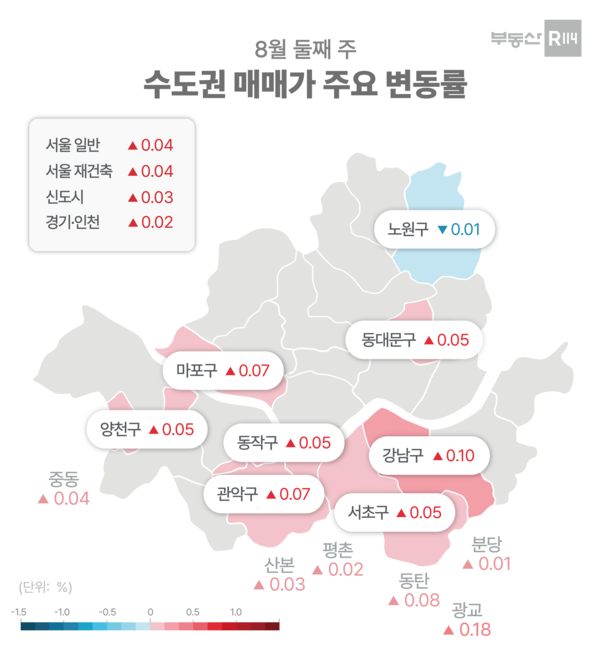 서울은 강남권 대단지와 서남권 정비사업 예정단지가 상승세를 주도했다. 개별지역으로는 △강남(0.10%) △마포(0.07%) △관악(0.07%) △양천(0.05%) △서초(0.05%) △동작(0.05%) △동대문(0.05%) △영등포(0.04%) 순으로 올랐고, 25개구 중 유일하게 노원은 -0.01% 떨어졌다. 신도시는 △광교(0.18%) △동탄(0.08%) 등 2기 신도시 위주로 오름폭이 컸다. 경기ㆍ인천은 △화성(0.07%) △안양(0.06%) △인천(0.05%) △안산(0.02%) △수원(0.01%) 등이 상승한 반면, 이천은 증일동 현대홈타운 등이 500만원가량 빠지며 0.07% 하락했다.