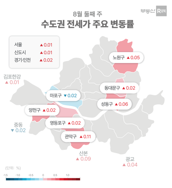 서울이 직전 주(0.05%)보다 상승폭이 축소돼 0.01%을 기록했다. 신도시가 0.01% 올랐고, 경기·인천은 0.02% 상승했다.
