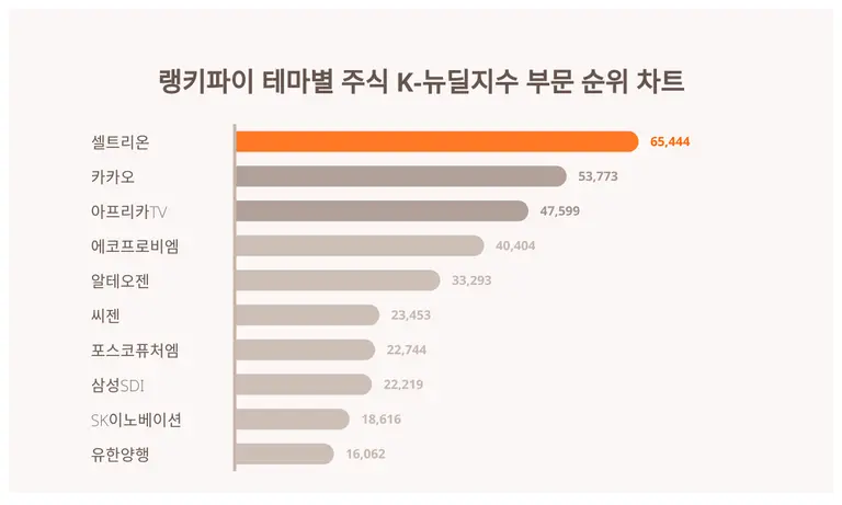테마별 주식 K-뉴딜지수 부문 트렌드지수에서 셀트리온 주가는 랭키파이 2024년 8월 2주차 트렌드지수 분석 결과 1위를 차지했다.