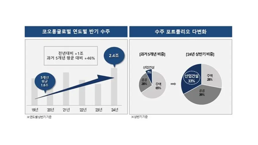 코오롱글로벌의 올해 상반기 수주 금액은 총 2.4조원 수준으로 집계됐다. 지난해 같은 기간 대비 수주 금액이 1조 이상 증가했다. 최근 5개년 상반기 평균수주금액 1.6조원 대비 46% 이상 늘었다.