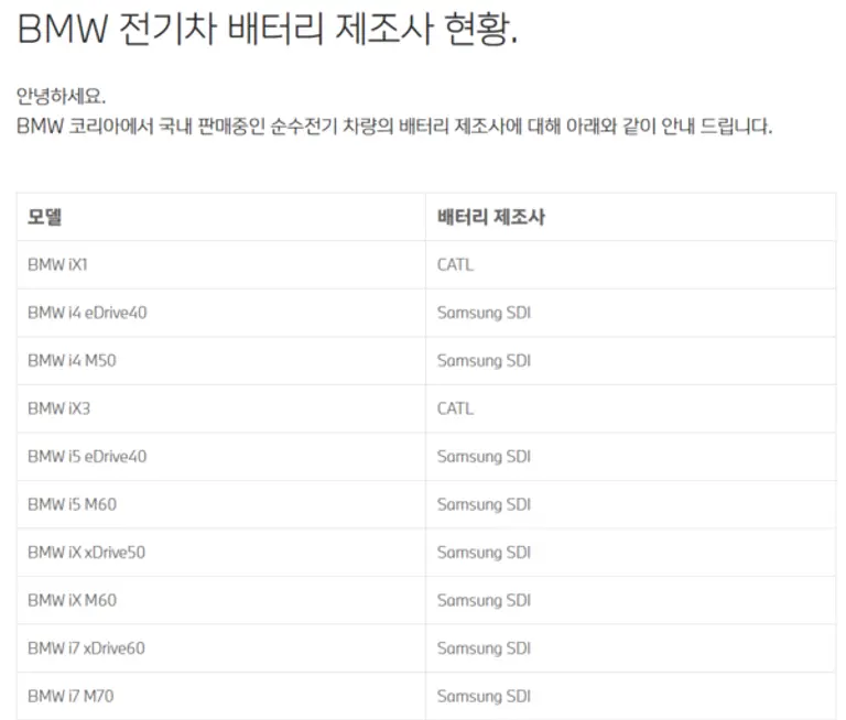 BMW코리아는 12일 BMW 전기차 배터리 제조사 현황을 공지했다.