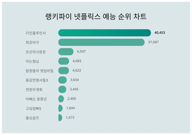 넷플릭스 예능 트렌드지수 선두에 선 1위는 40,453포인트를 기록한 더인플루언서, 바로 뒤 2위는 37,687포인트를 받은 최강야구(으)로 집계됐다.