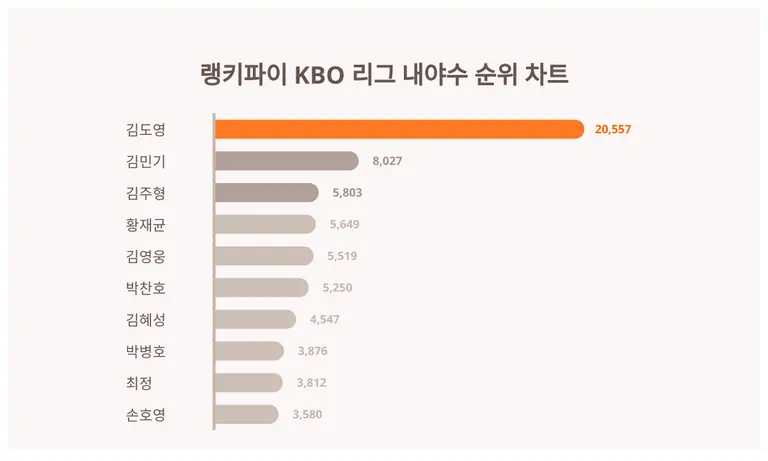 | 10 | 손호영 | 3,580 | 3,593 | -13 | -0.4% |