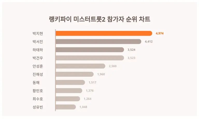 랭키파이에 따르면 8월 2주차 기준 미스터트롯2 참가자 트렌드지수 1위는 4,974포인트를 받은 박지현(으)로 선두를 잡았다. 이는 지난주 대비 338포인트 상승한 수치다.