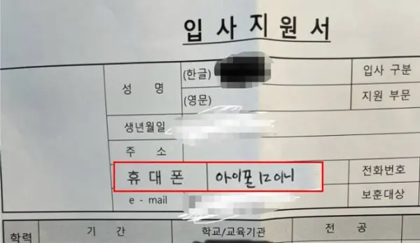 자신의 번호를 적는 입사지원서 '휴대폰'란에 번호 대신 휴대폰 기종을 적어낸 지원자가 있다는 사연이 알려졌다.