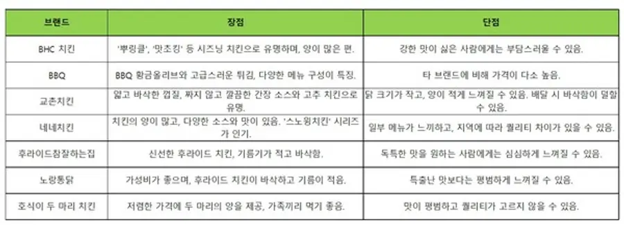 # 챗GPT 답변 : "치킨을 고를 때는 여러 가지 요소가 고려될 수 있는데, 각 브랜드마다 고유한 특징과 매력이 있습니다. 다음은 주요 치킨 브랜드별 장단점을 정리한 후 우선순위를 제안한 내용입니다."