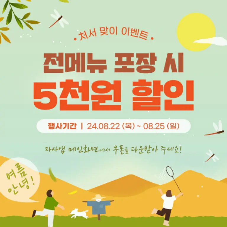 |스마트투데이=이은형 기자 | 깨끗한 기름, 좋은 식재료를 추구하는 치킨 브랜드 ‘바른치킨’이 여름의 끝을 알리는 처서를 맞아 5000원 할인 쿠폰을 제공하는 ‘여름 안녕’ 이벤트를 지난 25일까지 실시했다고 26일 밝혔다.