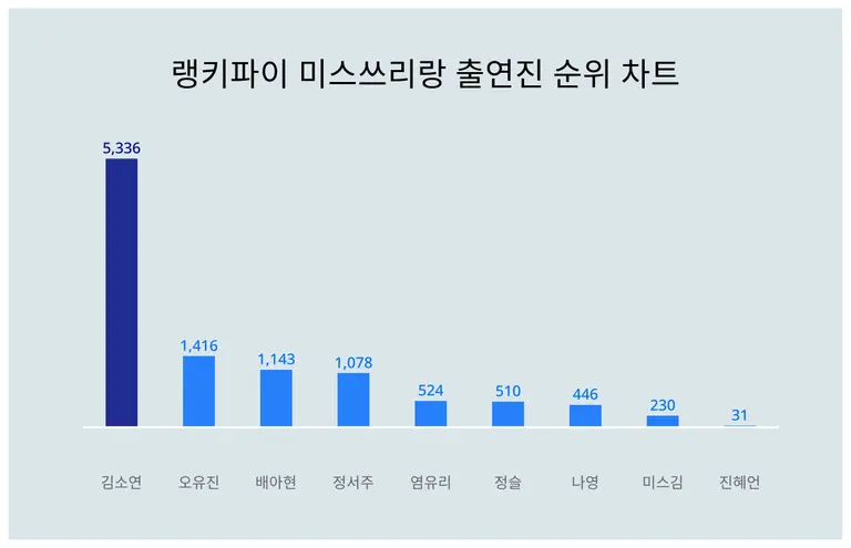 AI기반 빅데이터 프로그램을 갖춘 랭키파이는 각 분야별 트렌드지수를 도출한다. 이날 랭키파이 분석에 따르면 김소연이 8월 4주차 기준 미스쓰리랑 출연진 부문 트렌드지수 1위로 집계됐다.