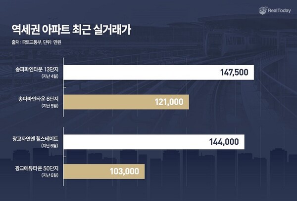 경기에서도 마찬가지다. 광교중앙역 초역세권 아파트 ‘광교자연앤힐스테이트’ 전용면적 84㎡는 지난 6월 14억4000만원에 거래됐다. 역시 비교적 거리가 있는 ‘광교에듀타운50단지’의 6월 거래가격(10억3000만원, 전용면적 84㎡기준)대비 4억이 넘게 차이 나는 금액이다.