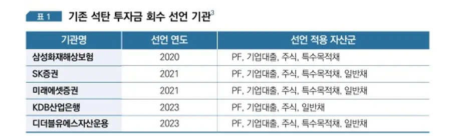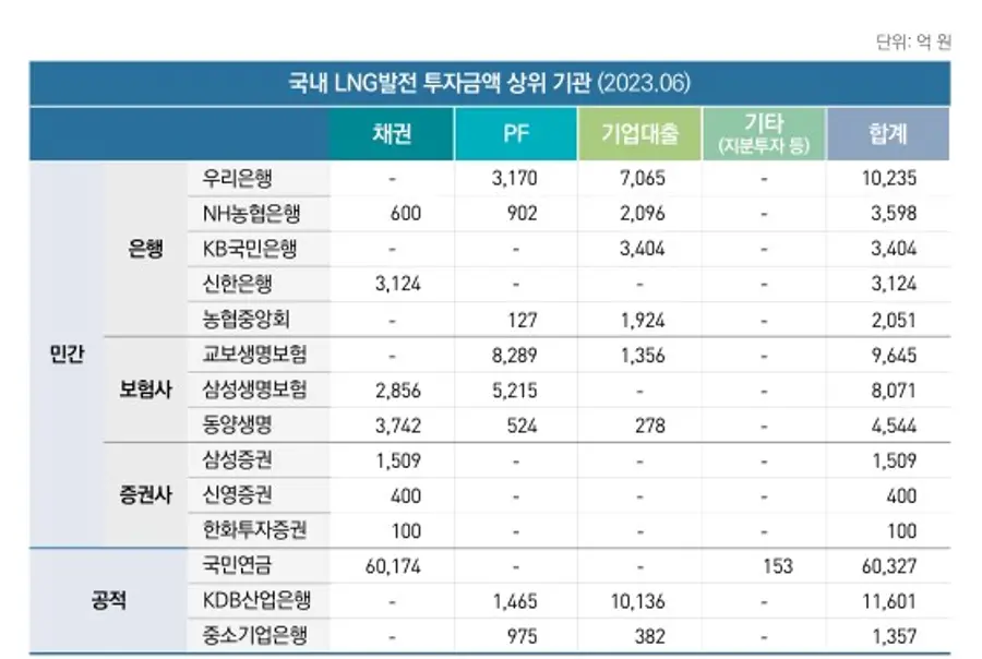 2023년 6월말 기준 공적금융섹터의 화석연료금융규모는 총 116.2조원에 달했다. 국민연금과 KDB산업은행, 한국전력 등의 투자액이 높았다. 시중은행 중에서는 우리은행의 투자규모가 가장 높았고, 보험사 중에서는 교보생명보험으로 투자규모가 각각 1조원 안팎으로 상대적으로 높았다.