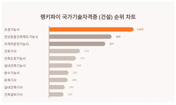 뒤를 이어 11위는 전산응용토목제도기능사, 12위 로더운전기능사, 13위 건축시공기술사, 14위 조경기사, 15위 도배기능사, 16위 배관기능사, 17위 기중기운전기능사, 18위 토목시공기술사, 19위 실내건축산업기사, 20위는 천장크레인운전기능사 순이다.