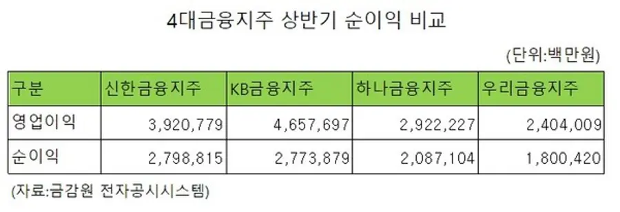 신한금융지주와 KB금융지주의 반기순이익이 각각 2조7988억원과 2조7739억원을 기록했고, 하나금융지주도 2조871억원의 순이익를 달성했다. 하지만 우리금융지주의 상반기 순이익은 1조8천억원에 그쳐, 2조원대로 올라서지 못했다.