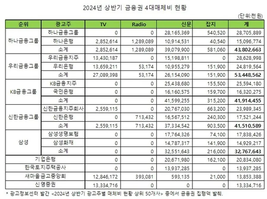 28일 한국광고총연합회의 광고정보센터 자료에 따르면, 올해 상반기 우리금융지주와 우리은행은 4대매체 광고비로 각각 286억원과 248억원을 집행했다.