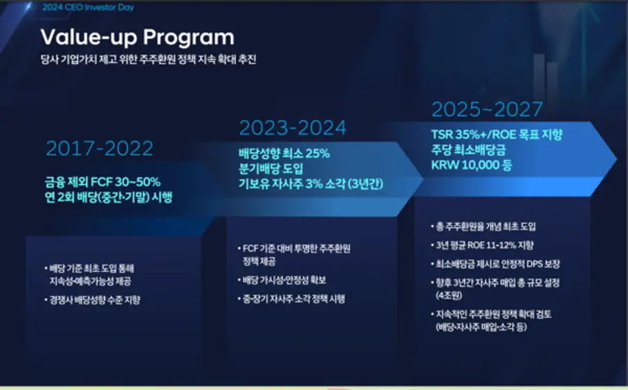 이어 2025년부터 2027년까지 향후 3개년 동안에는 TSR(총주주환원율) 35% 이상에 ROE 목표 지향으로 더 나아가기로 했다. 여기에는 주당 최소 1만원 배당도 포함된다.