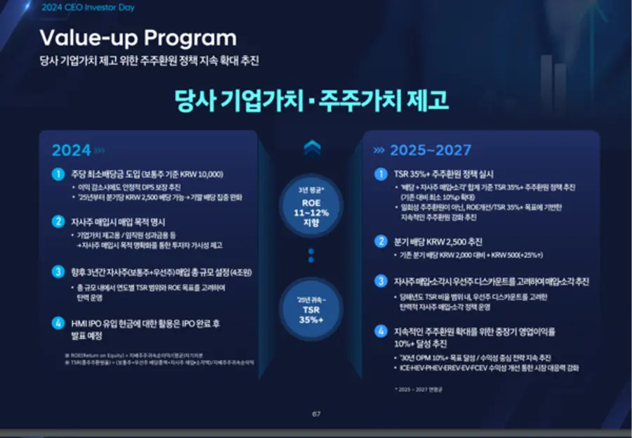 현대차는 총 주주환원율을 최초로 도입하는 한편 3년 평균 ROE 11~12%를 지향하며, 최소배당금 제시로 안정적 주당배당금을 보장하려 한다고 밝혔다.
