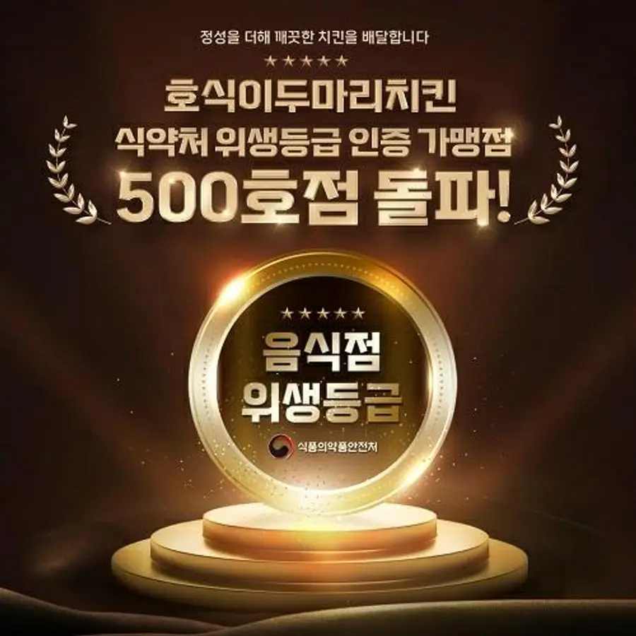 |스마트투데이=이은형 기자 | 치킨 프랜차이즈 호식이두마리치킨이 최근 위생등급 가맹점 500호점을 달성했다고 29일 밝혔다.
