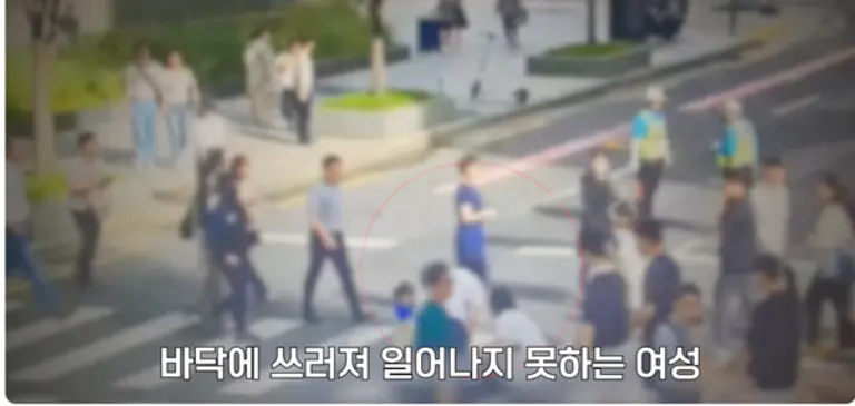 서울 강남 도로의 한 횡단보도. 길을 건너는 사람들 사이에서 한 여성이 쓰러져 있었고, 시민 여럿이 이 여성을 살핀다.