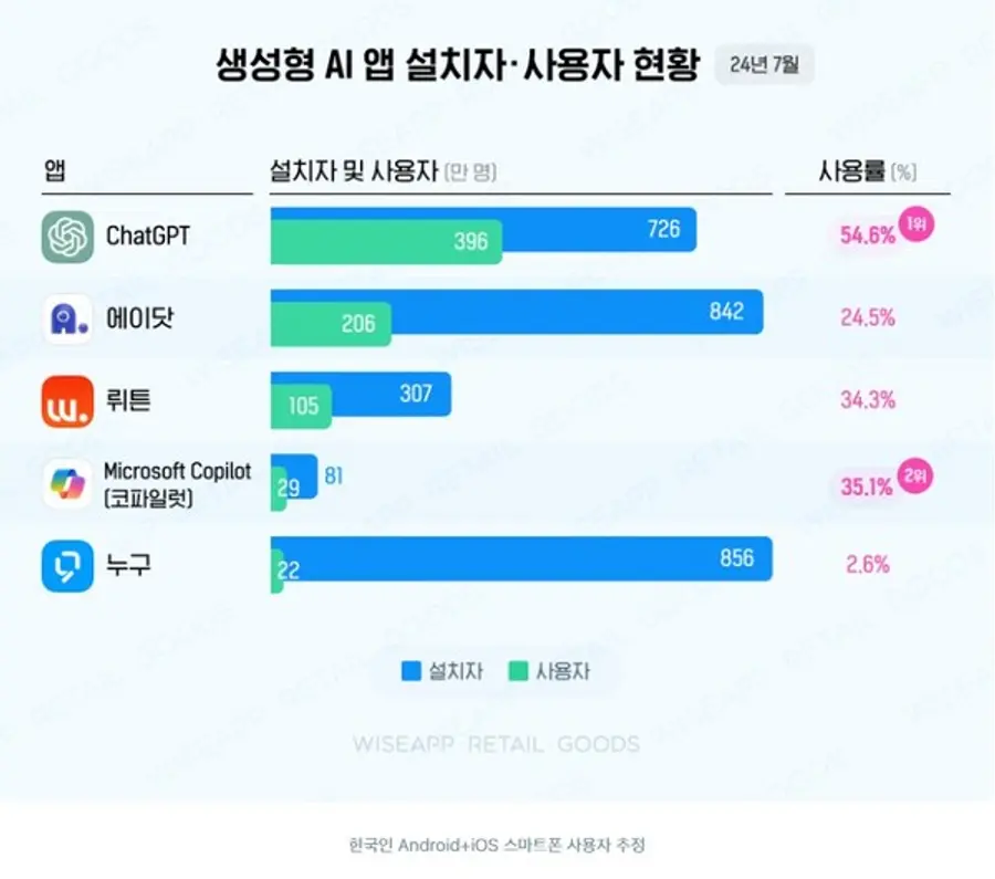 활용도가 가장 높은 앱은 오픈AI의 챗GPT와 마이크로소프트의 코파일럿(Copilot)이다. 이들의 사용률은 각각 54.6%와 35.1%로 1,2위를 기록중이다. SK텔레콤의 에이닷 사용률은 24.5%로 챗GPT의 절반 정도이나, 경쟁사인 KT에 비해서는 10배 가량 앞서 있다.