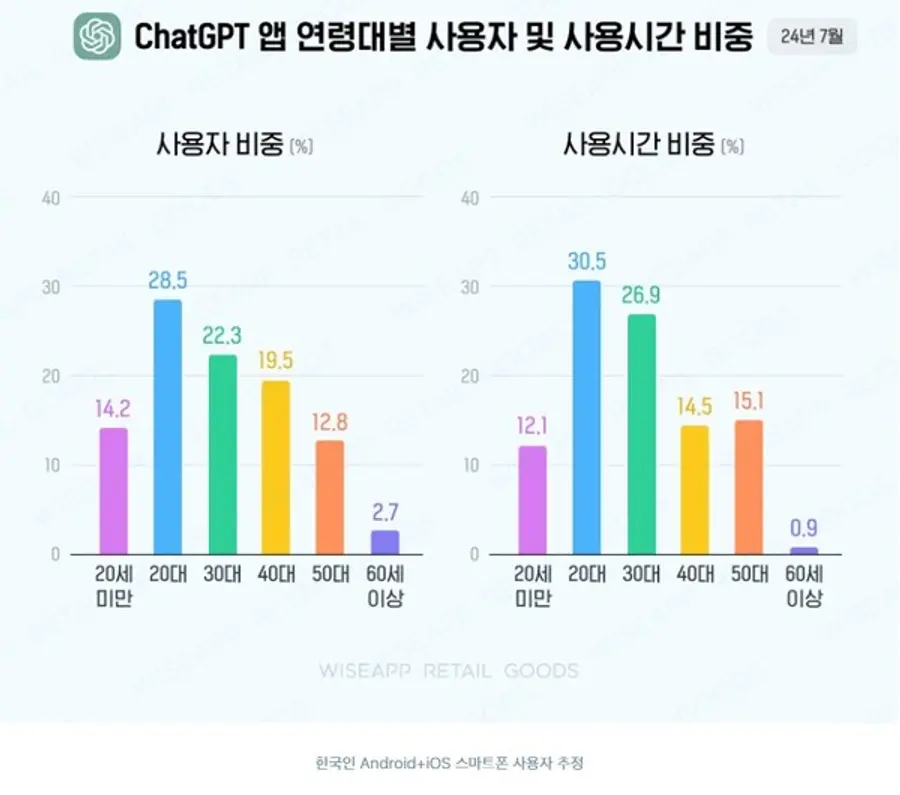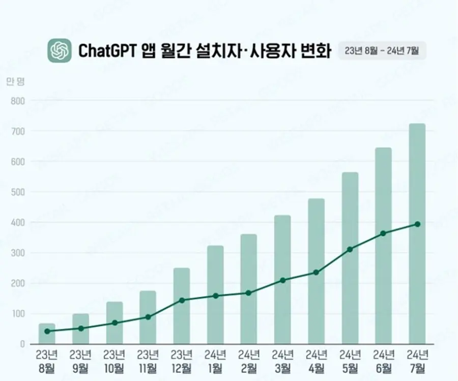 앱 종류별로 보면 챗GPT가 396만 명으로 가장 많았다. SK텔레콤의 에이닷(206만 명), 뤼튼테크놀로지스의 뤼튼(105만 명), 마이크로소프트 코파일럿(29만 명) 순으로 사용자수가 많았다.