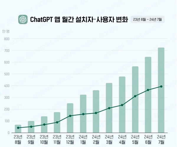 30일 앱/리테일분석서비스 와이즈앱·리테일·굿즈(주식회사 아이디어웨어)에 따르면 지난달 생성형 AI 서비스 앱 사용자는 673만명으로 지난 1월(420만 명)에 비해 6개월새 253만 명(60.2%)이 늘었다.
