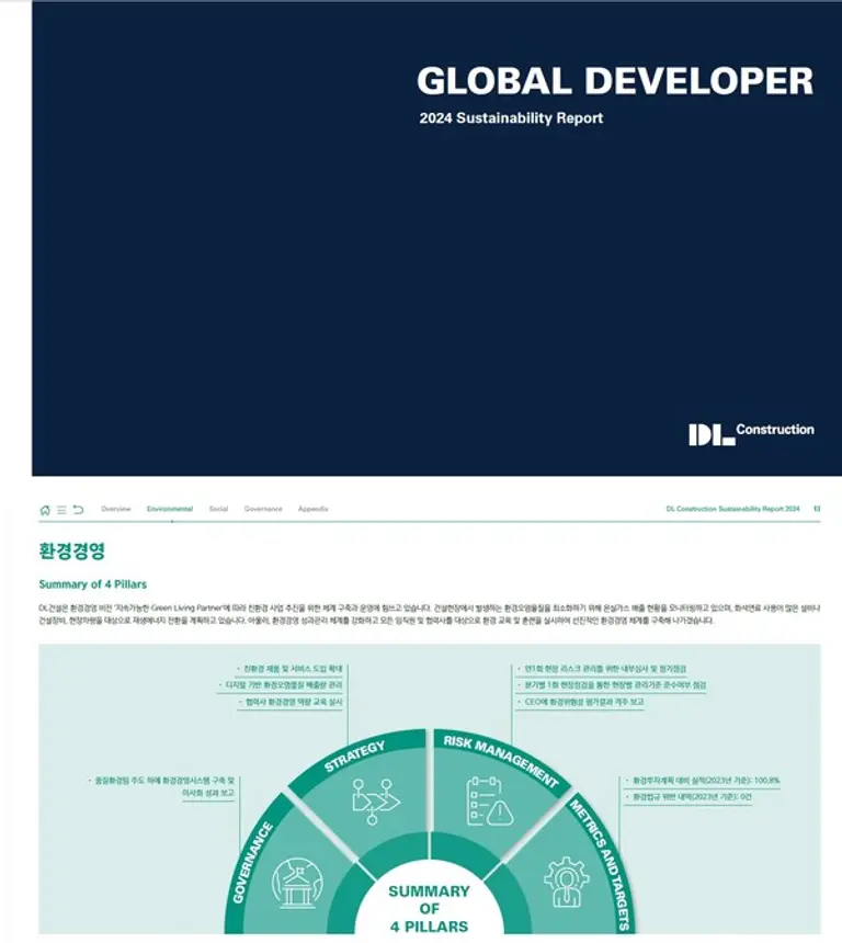 이번 보고서는 지난해 DL건설 본사 및 국내사업장 전체를 기준으로 작성됐다. 특히 객관성 및 신뢰성을 확보하기 위해, 최근 대외 공시 자료와 정부 기관 등의 신고 자료를 근거로 최근 3개년의 정보들을 담았다.