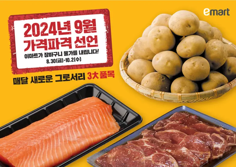 |스마트투데이=이재수 기자| 이마트는 추석을 앞두고 10월 2일까지 한 달간 '9월 가격파격 선언' 프로젝트로 감자·연어·양념 돼지고기를 특가에 판매한다고 3일 밝혔다.