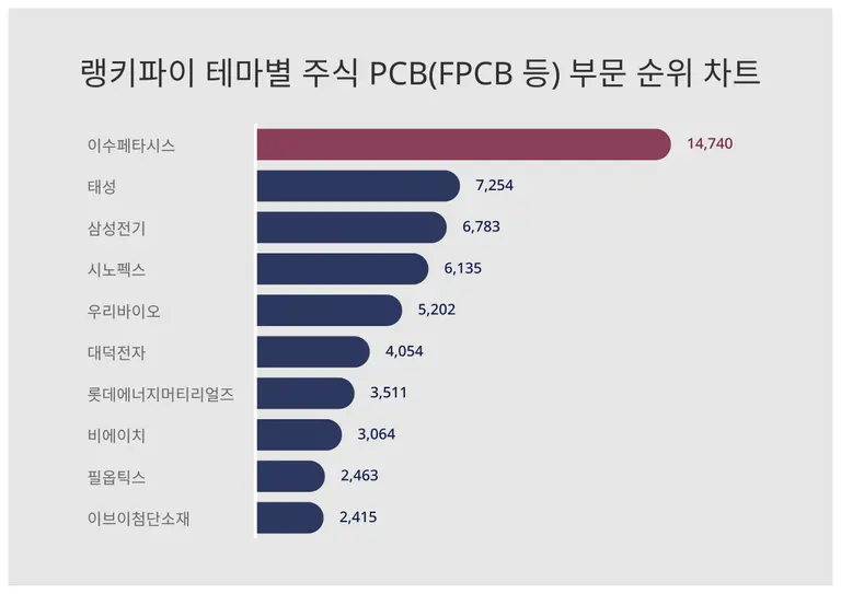 14,740포인트를 받은 이수페타시스가 테마별 주식 PCB(FPCB 등) 부문 트렌드지수 1위에 올랐다. 이어 2위는 7,254포인트가 나온 태성이다.