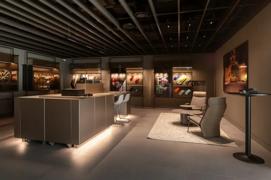 실내 전반에 이탈리아의 구시가지를 연상시키는 흙빛 톤의 컬러를 적용했으며 이탈리아의 하이엔드 가구 브랜드 ‘까시나 커스텀 인테리어(Cassina Custom Interiors)’가 디자인한 현대적인 가구와 진열장으로 고급감을 극대화했다. 벽면 진열장은 은은한 조명으로 휠 캡과 스티어링 휠을 보석처럼 비추며, 최고급 수공예 가죽 샘플도 만나볼 수 있다.