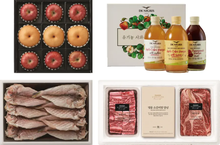 축산 선물세트는 10만원대 초반의 본판매 전용 한우 세트를 20% 할인가에 선보인다. ‘피코크 1등급 한우 갈비 등심 세트(등심 500g, 갈비 800g, 양념소스)’를 10만2400원에, 오마카세 콘셉트의 ‘1등급 한우 육마카세 세트(등심/채끝/안심/부채/안창/삼각 각 150g)’를 10만8000원에 판매한다.