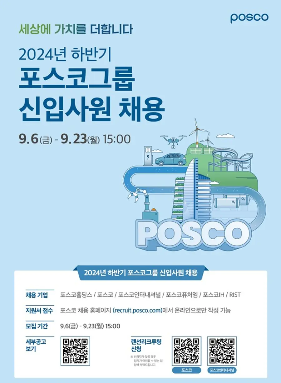 |스마트투데이=김세형 기자| 포스코그룹이 2024년 하반기 신입사원 채용에 나선다.
