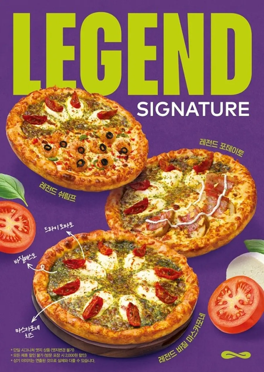 신메뉴 ‘레전드 바질 마스카포네’ 피자는 신선한 바질 페스토와 부드럽게 녹아 드는 프리미엄 마스카포네치즈(유크림 99.2%)와 드라이토마토를 토핑한 메뉴로 피자 엣지 끝까지 모짜렐라를 토핑하여 바삭하고 고소한 시그니처 엣지의 식감을 통해 즐거움을 더 했다. 판매 가격은 미디엄 사이즈 2만 2900원, 라지 사이즈 2만 9900원이다.
