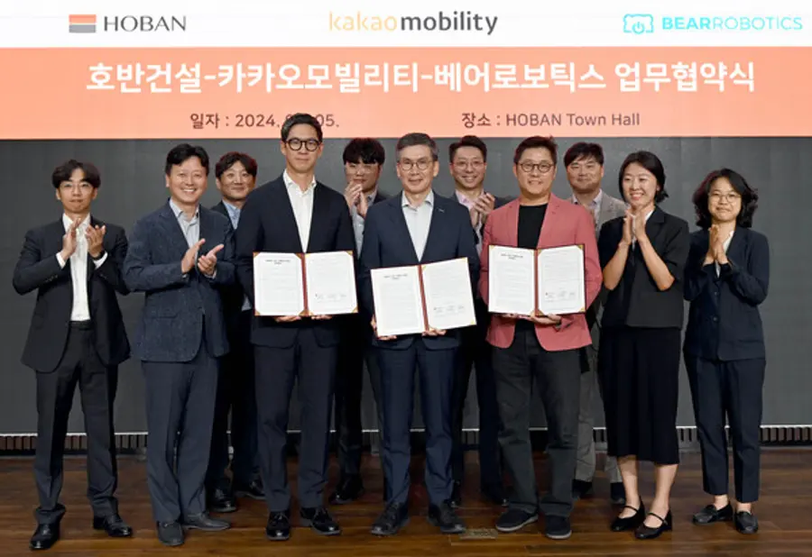 |스마트투데이=이재수 기자| 호반건설은 카카오모빌리티·베어로보틱스와 함께 실내배송로봇 운영환경 표준화 및 로봇 기반 특화서비스 공동개발을 위한 업무협약(MOU)을 체결했다고 6일 밝혔다.