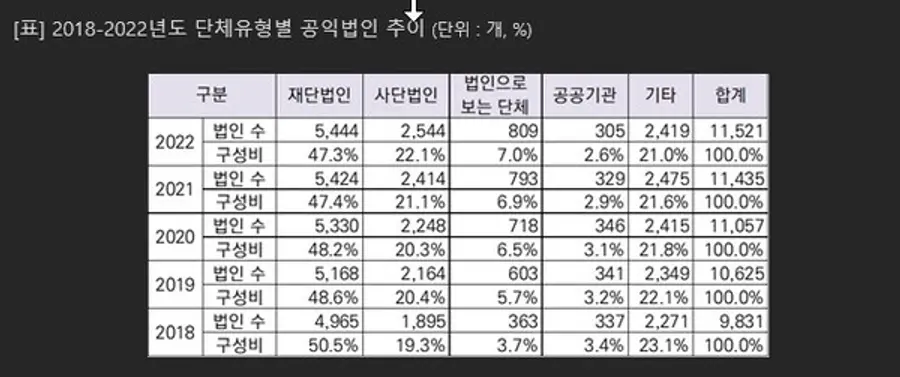 세부 유형별 공익법인 현황을 살펴보면 학술·장학, 사회복지, 문화 공익법인은 매해 증가한 것으로 나타났다. 반면 사업유형 교육, 의료 공익법인은 매해 비중이 감소하고 있는 것으로 드러났다. 또한 재단법인, 사단법인, 법인으로 보는 단체 수는 매해 증가한 반면 공공괴관과 기타 공익법인 비중은 줄고 있는 것으로 나타났다.