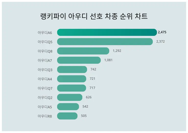 4위 아우디A7은 1,081포인트, 5위 아우디Q3은 742포인트, 6위 아우디A4는 721포인트, 7위 아우디Q7은 717포인트, 8위 아우디Q2는 626포인트, 9위 아우디A5는 542포인트, 10위 아우디R8은 505포인트이다.