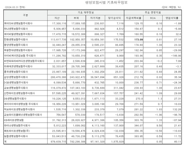 한화생명의 지급여력비율은 3월말 기준 173.09로 손보업계 평균값 224.7% 대비 51.61%p 뒤쳐지고 있다. 경쟁사인 삼성생명(212.79), DGB생명보험(236.77), 교보생명(238.93)에 크게 밑돌고 있다.