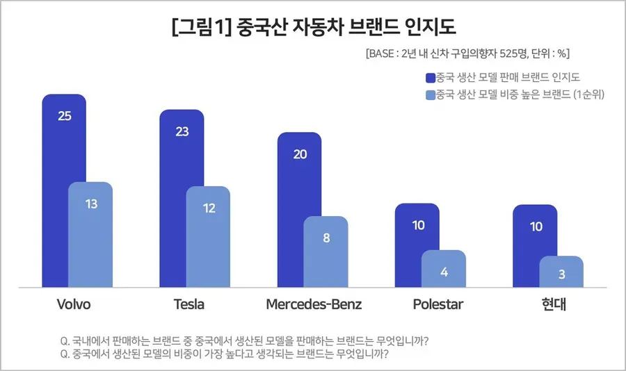 13일 컨슈머인사이트에 따르면 이번 조사는 2년 내 신차 구입 의향자 525명을 대상으로 매주 수행하는 신차 소비자 초기 반응을 통해 이뤄졌다. 이 가운데 5명 중 4명 꼴은 중국산 차에 대해 구입하지 않거나 재고할 것으로 생각한다. 국내 시판 브랜드 가운데 중국산 제품이 가장 많을 것으로 생각되는 브랜드는 볼보자동차(25%), 테슬라(23%), 메르세데스-벤츠(20%) 순으로 꼽았다. 이어 4위는 폴스타와 현대자동차가 공동으로 각각 10%를 기록했다.