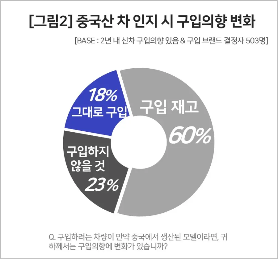 전기차와 관련해선 중국산에 대한 거부감이 매우 높은 것으로 나타났다. 구입하려던 전기차가 중국산이라면 '그대로 구입하겠다'는 의견은 18%에 불과하고, 대다수가 '구입을 재고'(60%)하거나 '구입하지 않겠다'(23%)고 답했다. 그러나 20~30대는 중국산이어도 '그대로 구입하겠다'는 응답 비율이 25%로 비교적 높았다. 40대는 22%, 50대는 15%, 60대 이상은 11%로 고령층으로 갈수록 낮아졌다.