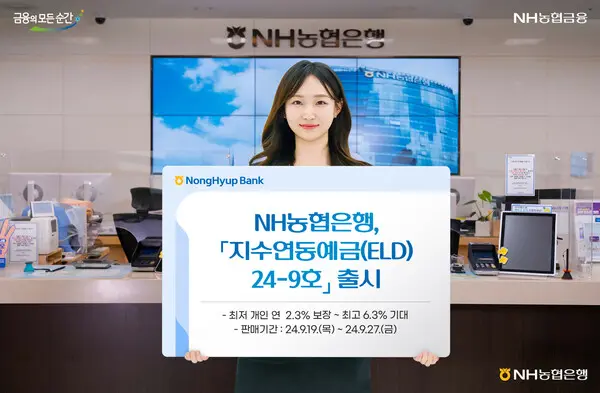 |스마트투데이=김국헌 기자| NH농협은행은 원금을 보장하면서 최고 연 6.3% 수익을 기대할 수 있는 지수연동예금(ELD) 24-9호를 출시했다고 19일 밝혔다.