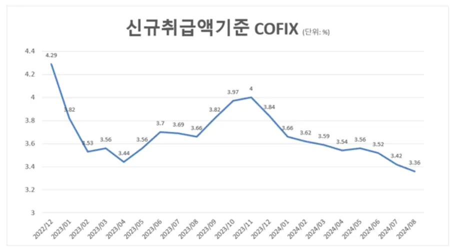 이는 지난 2022년 8월 2.96% 이후 최저치다. 올해 초 3%대 중반이었던 코픽스는 3%대 초반으로 내려섰다.