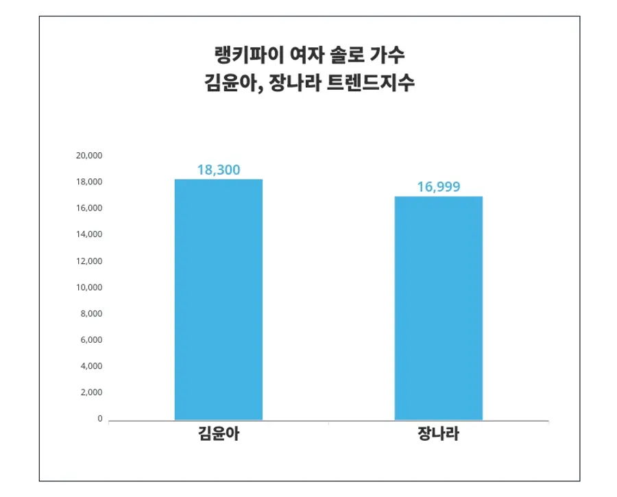 랭키파이의 9월 3주차 여자 솔로 가수 분석에 따르면, 김윤아가 '18,300포인트'로 리드 하고 있으며, 장나라가 '16,999포인트'로 그 뒤를 이었다. 두 트렌드 사이의 트렌드지수 차는 '1,301포인트'로 집계되었다.