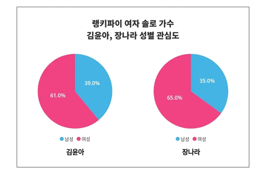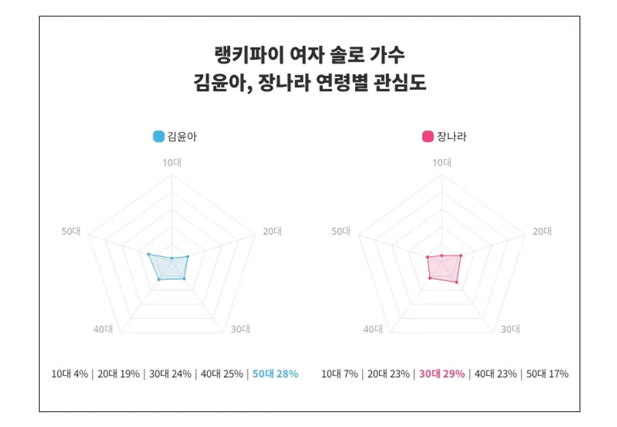 또한 김윤아와 장나라 사이에서 연령별 관심도 분포가 뚜렷이 나타났다. 김윤아는 50대에서 28%로 가장 높은 관심도를 보여주며, 10대 4%, 20대 19%, 30대 24%, 40대 25%, 50대 28% 순으로 연령대별 관심 분포가 나타났다.