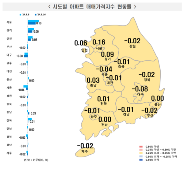 시도별로는 경기(0.09%), 인천(0.06%), 충남(0.03%), 전북(0.01%) 등은 상승, 울산(0.00%), 전남(0.00%)은 보합, 대구(-0.08%), 제주(-0.02%), 경북(-0.02%), 강원(-0.02%) 등은 하락했다.