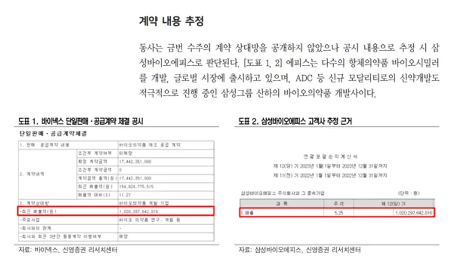 신영증권은 "신규 고객사는 삼성바이오에피스(이하 에피스)로 추정되며, 에피스는 다수의 바이오시밀러 품목을 보유하고 있어 MSA에 따라 추가 수주도 기대해 볼 수 있을 것"이라고 기대했다. 신영증권 역시 삼성바이오에피스 추정의 근거로 매출 규모를 제시했다.