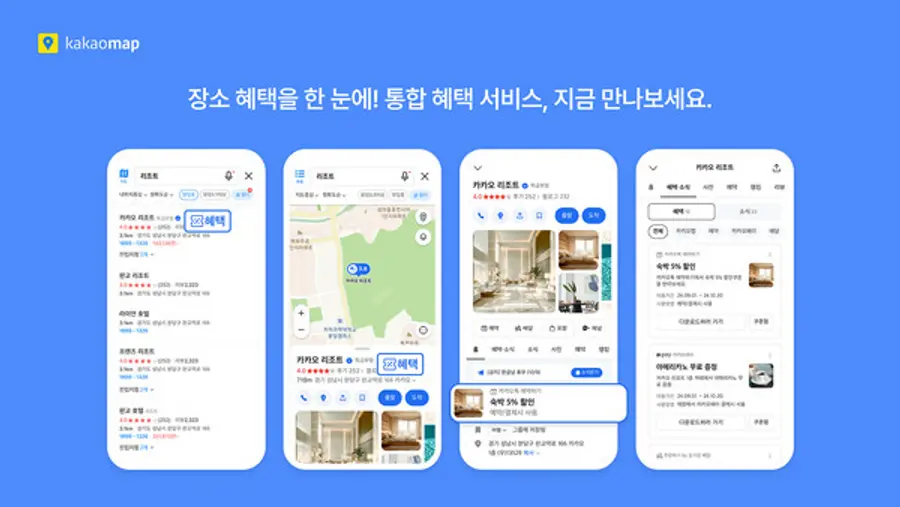 카카오맵 통합 혜택 서비스는 상품 할인 쿠폰 제공, 무료 증정 등 각 장소에서 이용할 수 있는 다양한 혜택 정보를 카카오맵 안에 한 데 모아 제공하는 것이 특징이다.