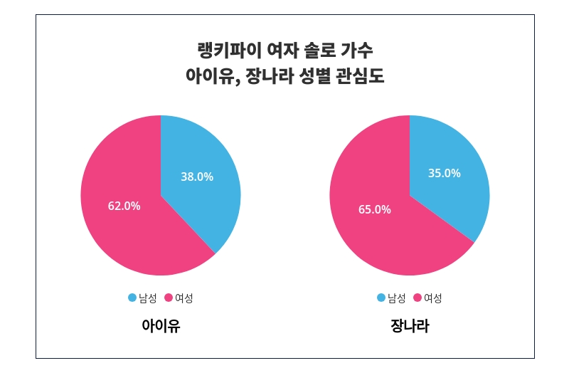 성별 관심도 조사 결과, 아이유는 '여성'에서 '62%'로 남성보다 높은 관심을 받는 것으로 나타났다.