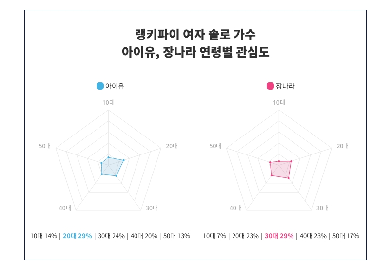 또한 아이유와 장나라 사이에서 연령별 관심도 분포가 뚜렷이 나타났다. 아이유는 20대에서 29%로 가장 높은 관심도를 보여주며, 10대 14%, 20대 29%, 30대 24%, 40대 20%, 50대 13% 순으로 연령대별 관심 분포가 나타났다.