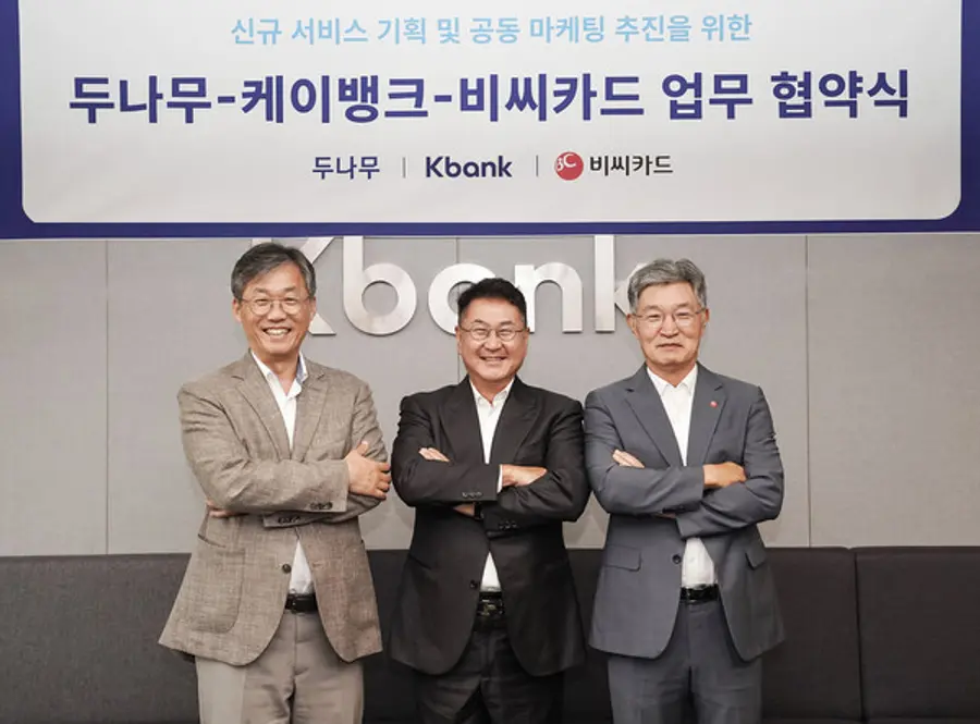 케이뱅크는 서울 중구 을지로 본사에서 두나무, BC카드와 서비스 연동 및 공동 마케팅 추진을 위한 업무협약을 체결했다고 27일 밝혔다.