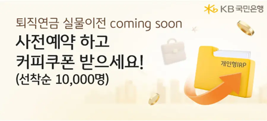 KB국민은행으로 다른 금융회사 개인형 퇴직연금(IRP) 계좌의 실물이전을 사전 예약하면, 선착순 1만명에게 스타벅스 커피 쿠폰을 제공한다.