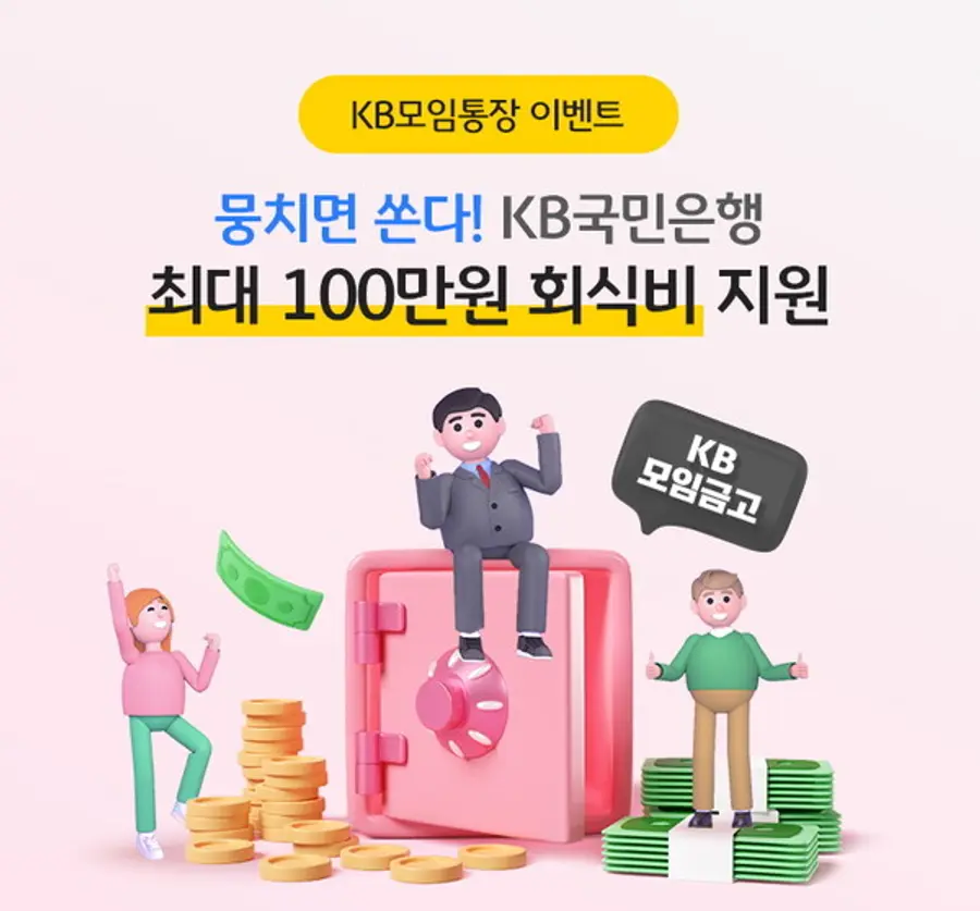 KB모임통장 서비스에 가입한 총무가 모임원을 초대하고, KB모임금고에 신규 가입하고, 이벤트에 응모하면, 추첨을 통해 30개 모임에 1인당 5만원, 최대 100만원의 회식비를 지급한다.