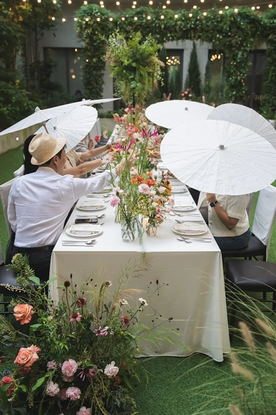 결혼식장 곳곳에서 웰컴 드링크를 즐길 수 있으며, 야외 웨딩의 특색을 살려 인생 사진을 남길 수 있는다양한 장치를 준비했다. 햇빛을 가리는 모자, 하얀 지우산과 부채 등 하객들이 즐길 수 있는 다양한 소품을 비치해 웨딩 홀 자체가 포토존으로 톡톡히 역할하고 있다.